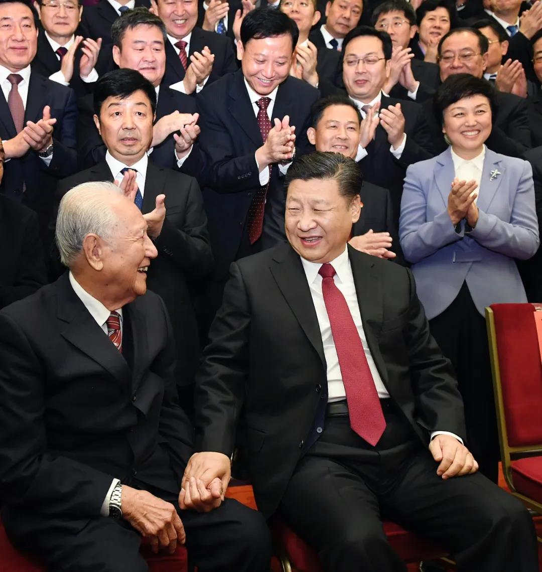 当习近平回到队伍中间,准备同代表们合影时,看见了在后排站立的93岁的黄旭华和82岁的黄大发两位道德模范代表。