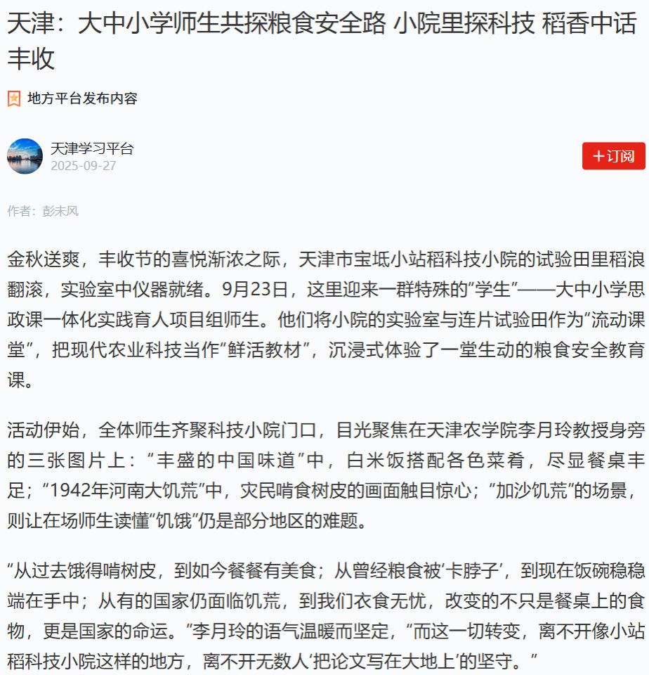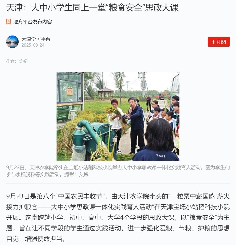 近日,在第八个“中国农民丰收节”来临之际,我校“一粒粟中藏国脉 薪火接力护粮仓——大中小学思政课一体化实践育人活动”在天津宝坻小站稻科技小院开展。这场融合专业课与思政课的大中小学一体化实践育人活动,深度整合小站稻科技小院资源优势,开展“专业实践+思政研学”主题活动,充分发挥了“思政+专业”双师协同育人效能,形成“思政教师补专业实践、专业教师补思政理论”的互补格局,让思政教育从“单点输出”变为“双向赋能”。《天津日报》《天津教育报》、央广网、学习强国平台等多家媒体对此次活动进行了报道。