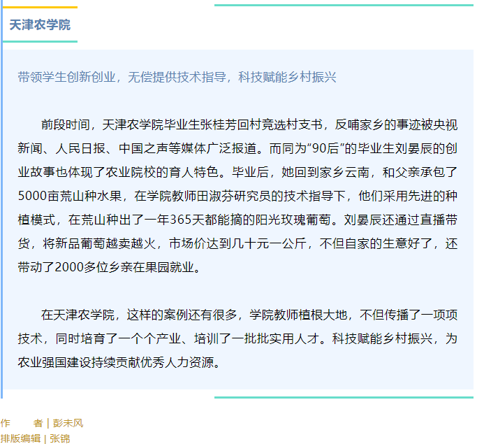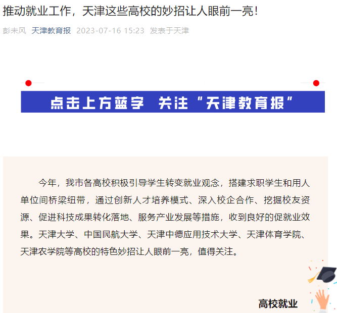 2023年7月16日,天津教育报微信公众号报道我校采用“带领学生创新创业,无偿提供技术指导,科技赋能乡村振兴”的特色妙招,收到良好的促就业效果。