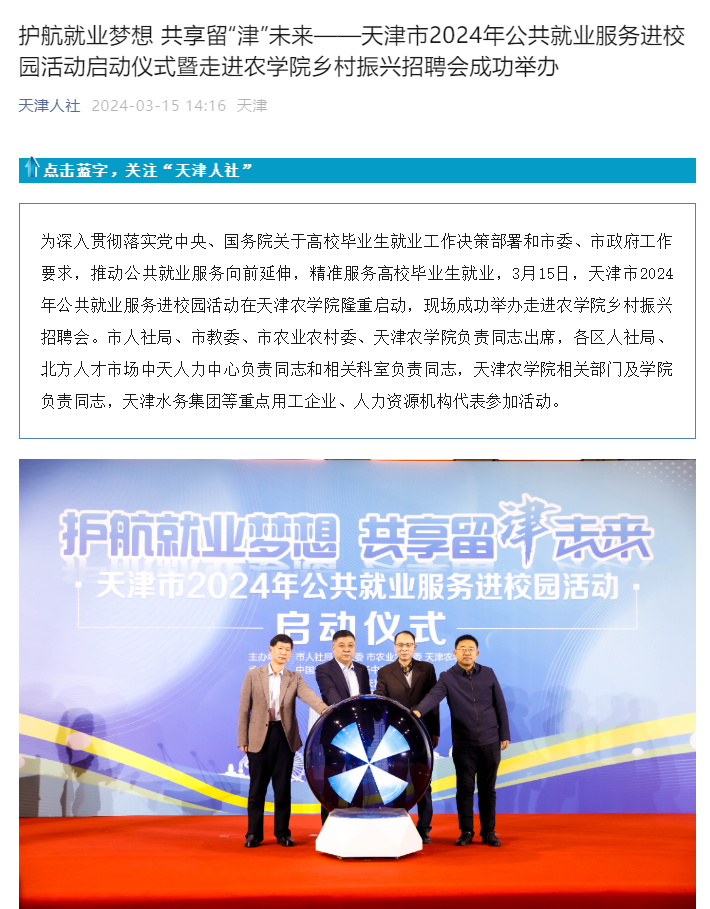 2024年3月15日,天津人社公众号报道天津市2024年公共就业服务进校园活动在我校隆重启动,现场成功举办走进农学院乡村振兴招聘会。
