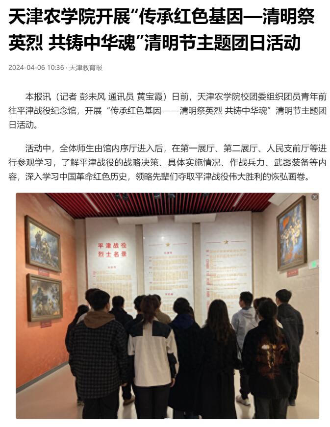 2024年4月6日,天津教育报报道我校团委组织团员青年前往平津战役纪念馆,开展“传承红色基因——清明祭英烈 共铸中华魂”清明节主题团日活动。