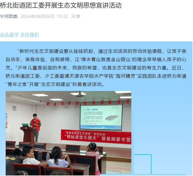 2024年8月6日,宁河团委公众号报道桥北街道团工委、少工委邀请我校水产学院“海河精灵”实践团队走进桥北街道“青年之家”开展“生态文明建设”科普宣讲活动。