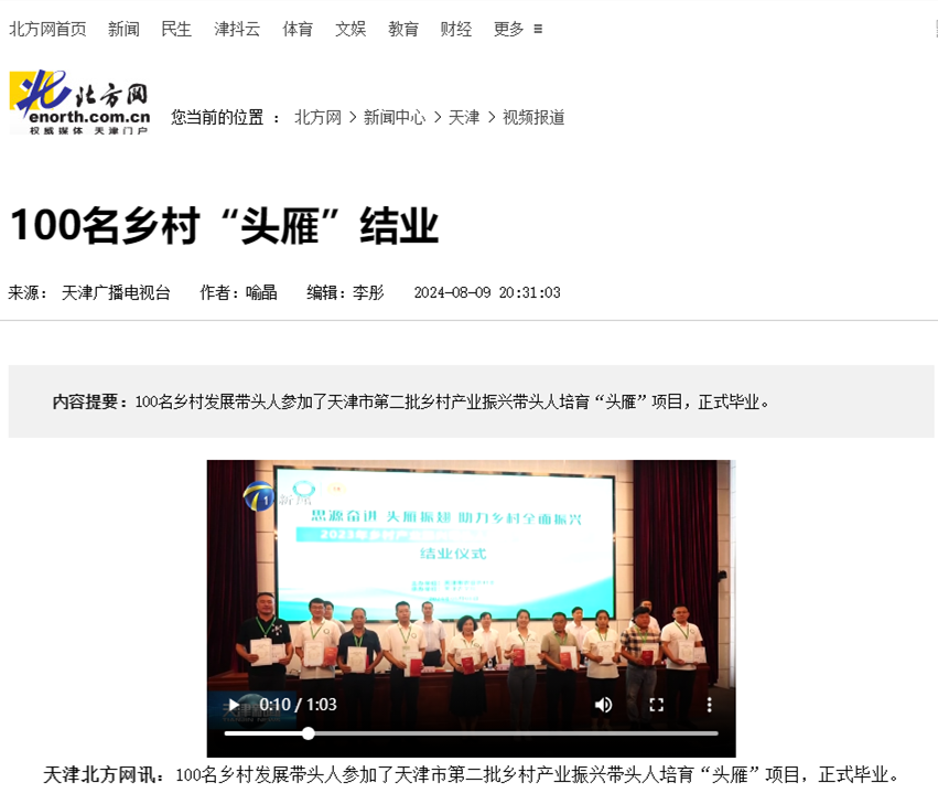 2024年8月9日,天津新闻频道报道天津市第二批乡村产业振兴带头人培育“头雁”项目结业仪式在我校举办。100名乡村发展带头人参加了天津市第二批乡村产业振兴带头人培育“头雁”项目,正式毕业。