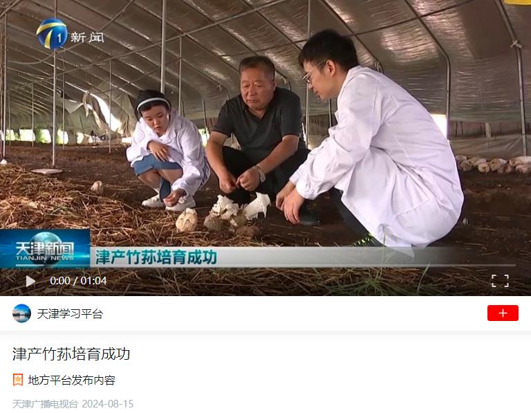 2024年8月15日,学习强国平台-天津广播电视台报道,我校科研人员与菇农们成功培育出津产竹荪。