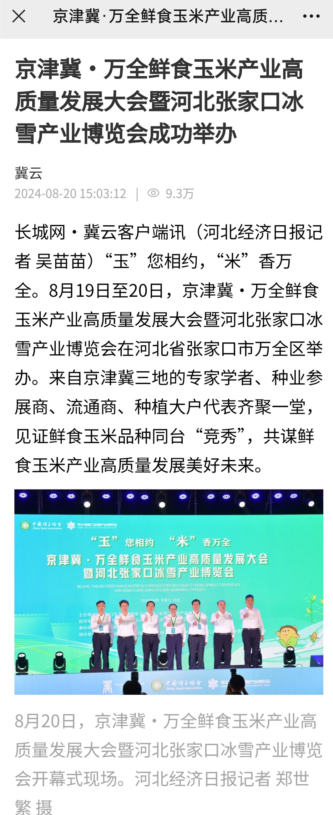 2024年8月20日,冀云客户端报道我校校领导带队参加万全鲜食玉米产业高质量发展大会暨河北张家口冰雪产业博览会并签署相关合作协议。