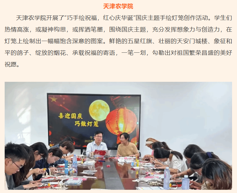 2025年10月2日,天津教育报微信公众号对我校开展的“巧手绘祝福,红心庆华诞”国庆主题手绘灯笼创作活动进行了报道。