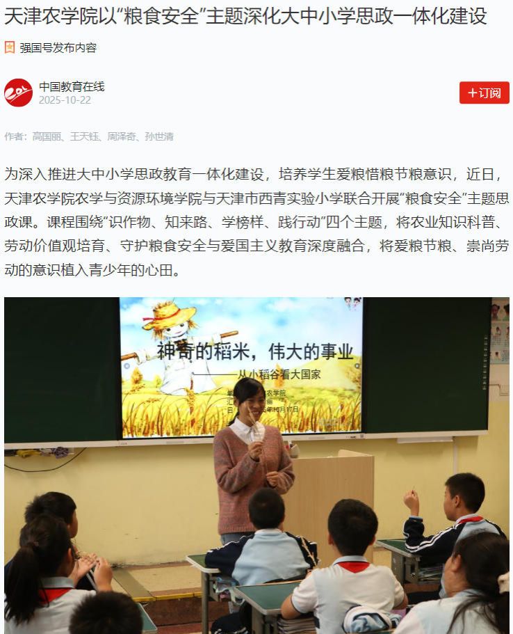 2025年10月22日,学习强国平台、中国教育在线网报道,我校农学与资源环境学院与天津市西青实验小学联合开展“粮食安全”主题思政课。课程围绕“识作物、知来路、学榜样、践行动”四个主题,将农业知识科普、劳动价值观培育、守护粮食安全与爱国主义教育深度融合,将爱粮节粮、崇尚劳动的意识植入青少年的心田。