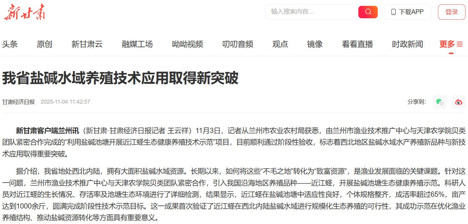 2025年11月4日,新甘肃客户端报道,由兰州市渔业技术推广中心与我校贝类团队紧密合作完成的“利用盐碱池塘开展近江蛏生态健康养殖技术示范”项目,目前顺利通过阶段性验收,标志着西北地区盐碱水域水产养殖新品种与新技术应用取得重要突破。