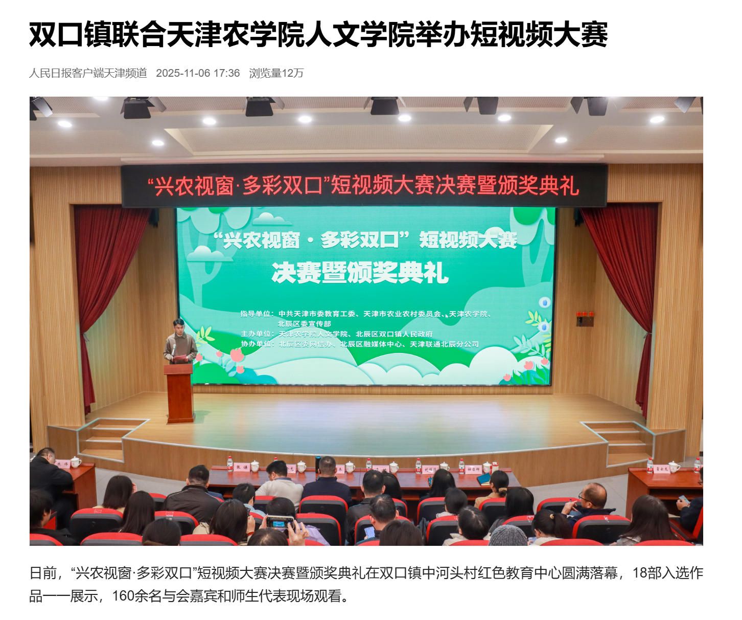2025年11月6日,人民日报客户端报道我校“兴农视窗·多彩双口”短视频大赛决赛暨颁奖典礼在双口镇中河头村红色教育中心圆满落幕,18部入选作品一一展示,160余名与会嘉宾和师生代表现场观看。