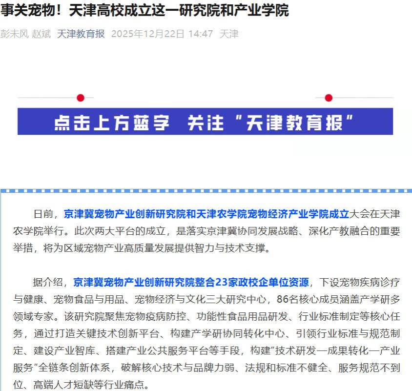 2025年12月22日,天津教育报公众号报道京津冀宠物产业创新研究院和天津农学院宠物经济产业学院成立大会在我校举行。