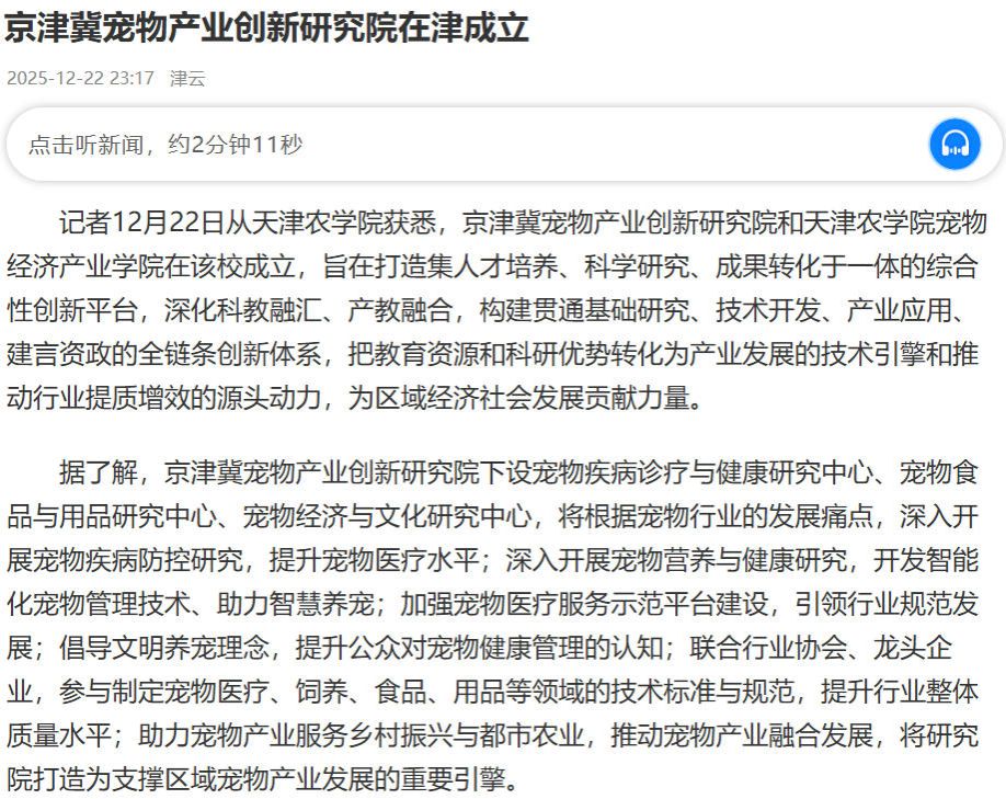 2025年12月22日,津云报道京津冀宠物产业创新研究院在京津冀宠物产业创新研究院和天津农学院宠物经济产业学院在我校成立,旨在打造集人才培养、科学研究、成果转化于一体的综合性创新平台。