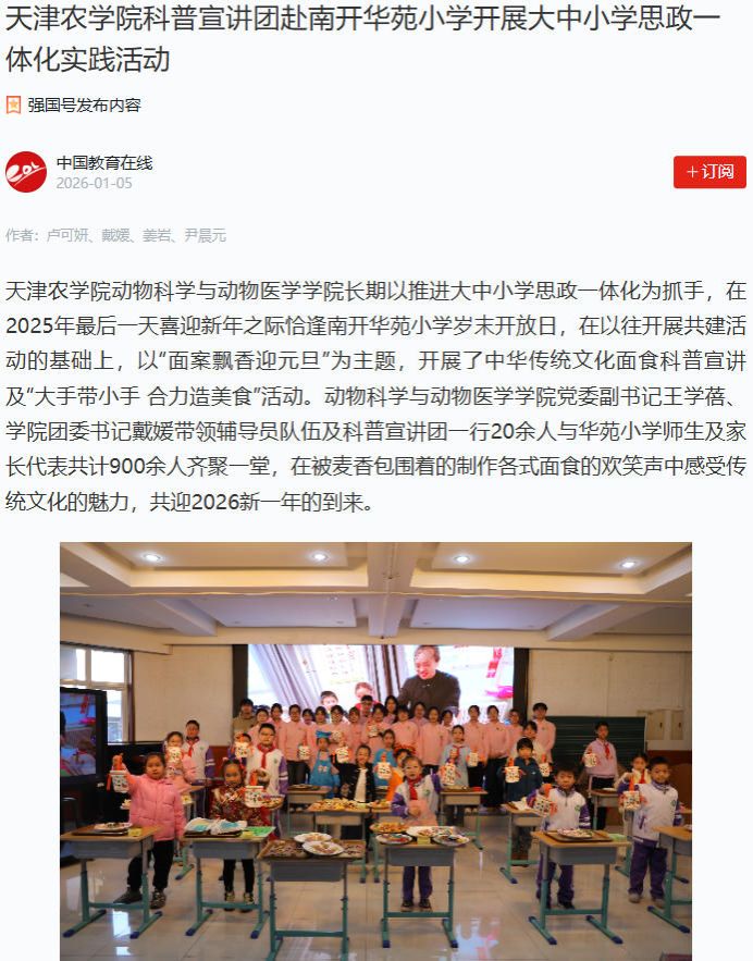 2026年1月5日,学习强国平台、中国教育在线网报道,我校动物科学与动物医学学院长期以推进大中小学思政一体化为抓手,在2025年最后一天喜迎新年之际恰逢南开华苑小学岁末开放日,在以往开展共建活动的基础上,以“面案飘香迎元旦”为主题,开展了中华传统文化面食科普宣讲及“大手带小手 合力造美食”活动。