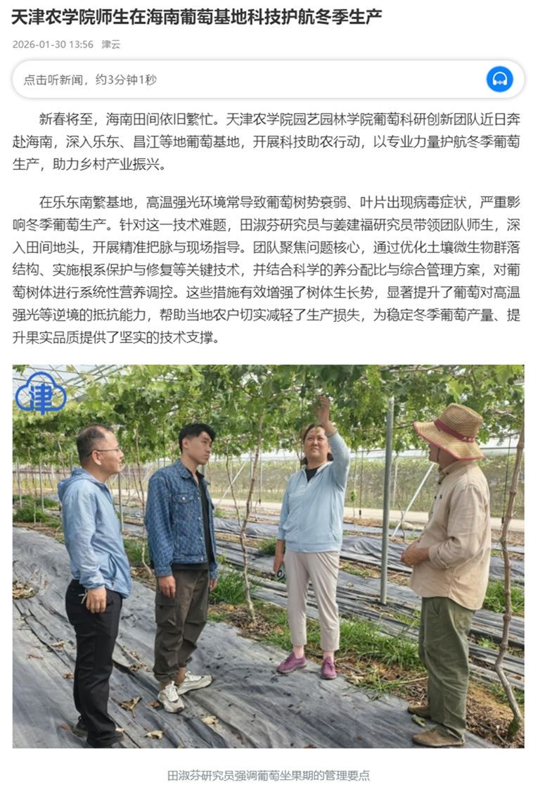2026年1月30日,津云报道,我校园艺园林学院葡萄科研创新团队近日奔赴海南,深入乐东、昌江等地葡萄基地,开展科技助农行动,以专业力量护航冬季葡萄生产,助力乡村产业振兴。