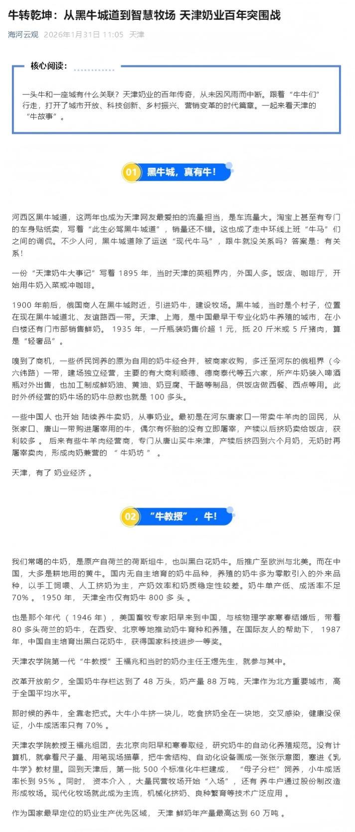 2026年1月31日,海河云观公众号报道,我校第一代“牛教授”王福兆、第二代“牛教授”张学炜,持续助力天津奶业发展的事迹。