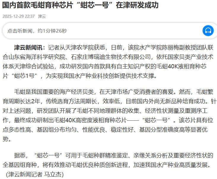 2025年12月29日,津云报道,我校水产学院陈丽梅副教授团队联合山东省海洋科学研究院、石家庄博瑞迪生物技术有限公司,依托国家贝类产业技术体系天津综合试验站,成功研发国内首款具有自主知识产权的毛蚶40K液相育种芯片“蚶芯1号”,为实现我国水产种业科技创新提供技术支撑。