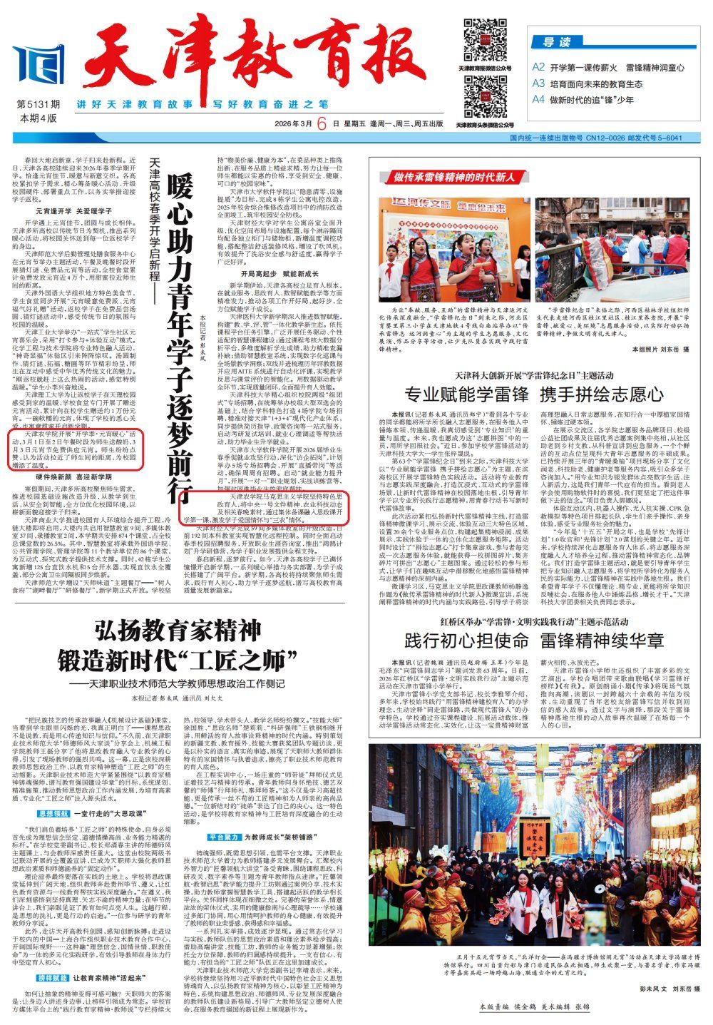 2026年3月6日,《天津教育报》报道我校开展“开学季·元宵暖心”活动,为校园开学季增添了温度。马克思主义学院通过集体备课融人思政课开学第一课,激发学子爱国情怀与“三农”情怀。