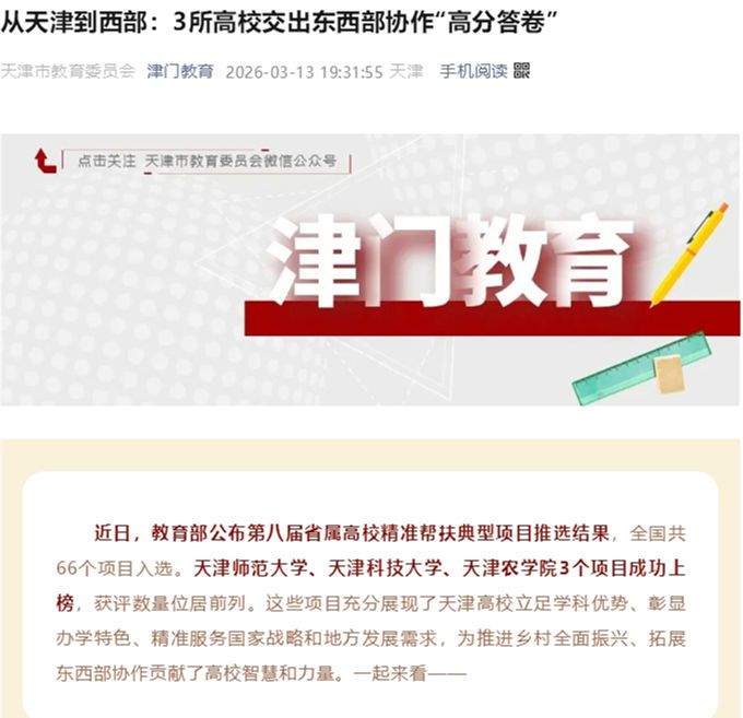 2026年3月13日,津门教育公众号报道,教育部公布第八届省属高校精准帮扶典型项目推选结果,我校报送的项目《一粒种子激活西部农业之“芯”——天津农学院科技支援西部地区农业发展的实践模式》成功入选。