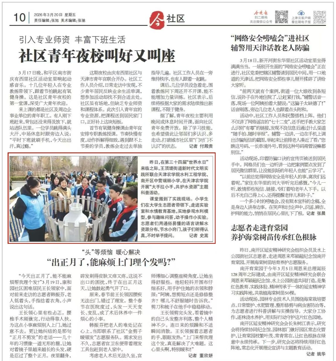 2026年3月20日,《今晚报》报道,我校水利工程学院师生开展“大手拉小手,共护水资源”主题科普活动。