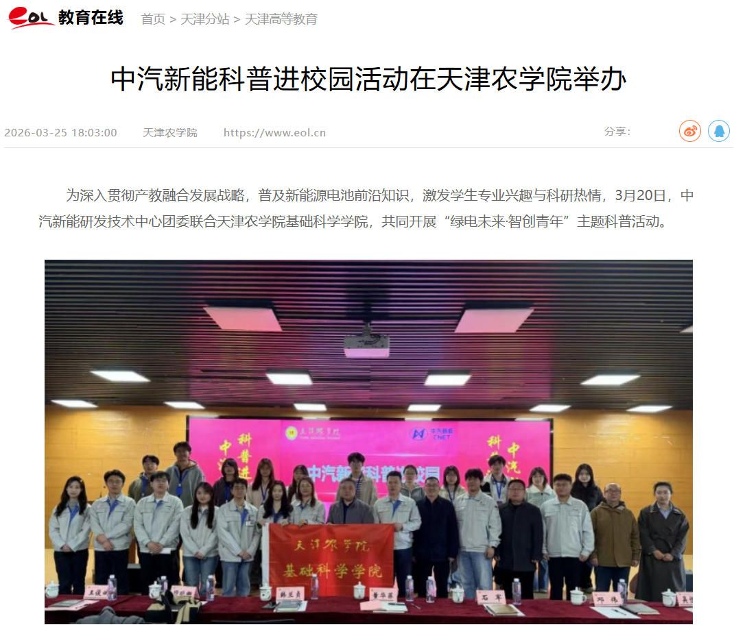 2026年3月25日,中国教育在线网报道,中汽新能研发技术中心团委联合我校基础科学学院,共同开展“绿电未来·智创青年”主题科普活动。