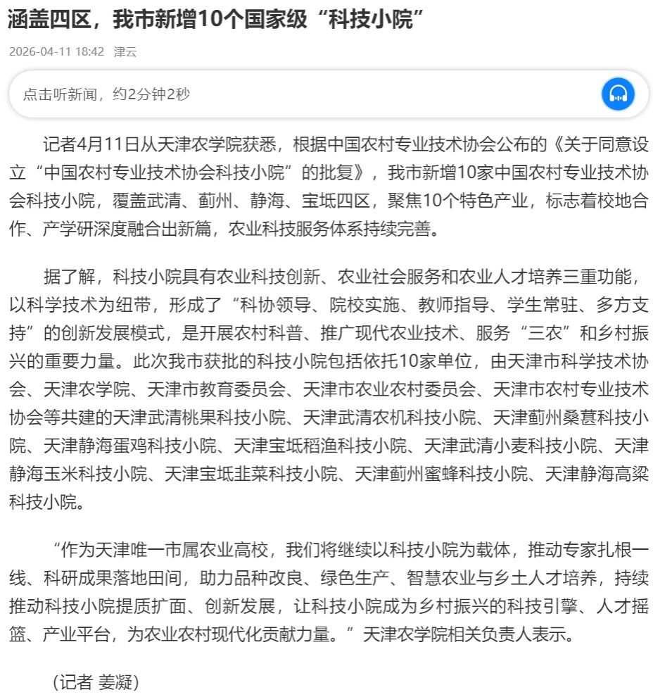 2026年4月11日,津云报道,我校新增10家中国农村专业技术协会科技小院,覆盖武清、蓟州、静海、宝坻四区,聚焦10个特色产业,标志着校地合作、产学研深度融合出新篇,农业科技服务体系持续完善。