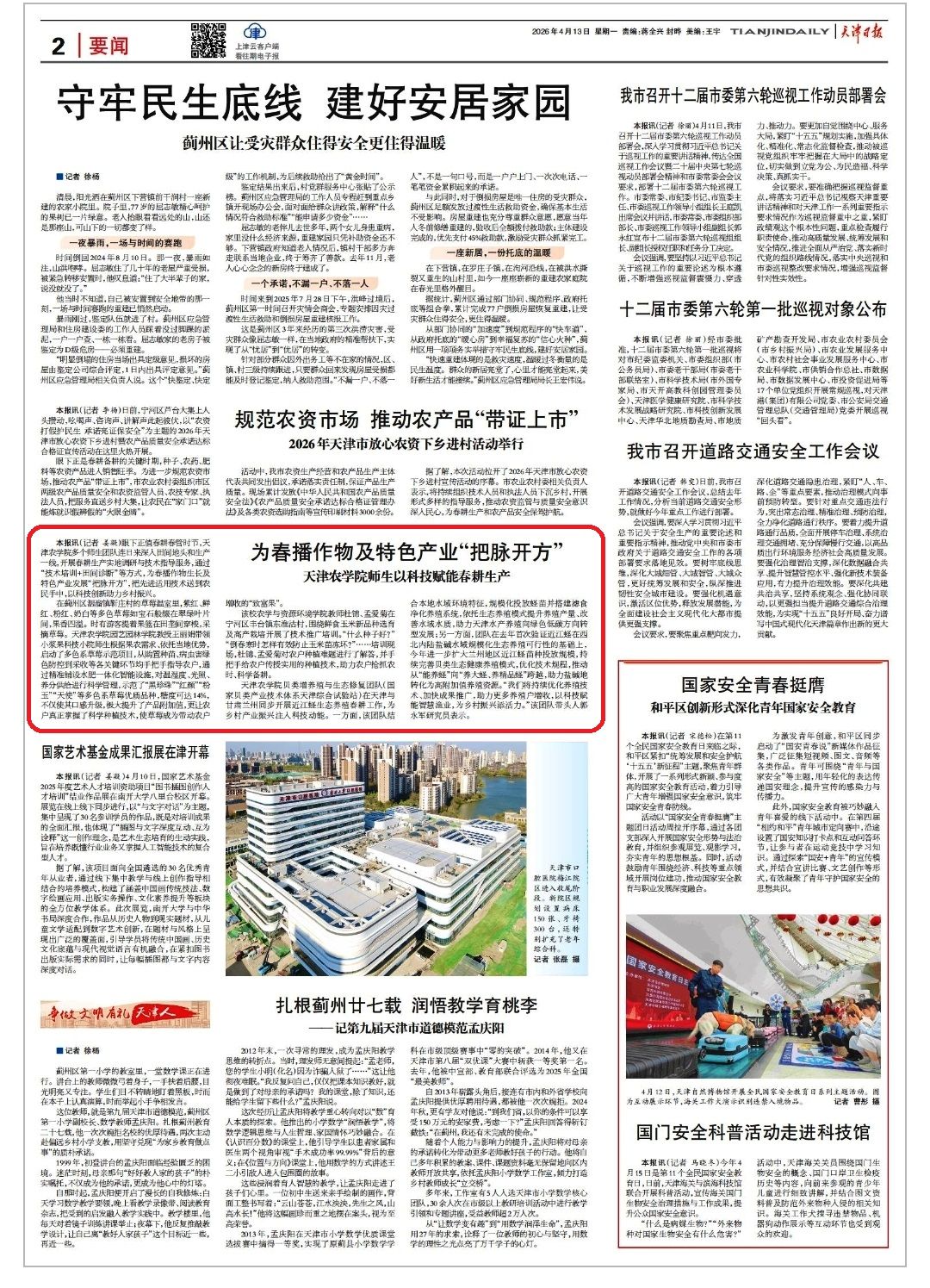 2026年4月13日,《天津日报》要闻版报道,我校多个师生团队连日来深入田间地头和生产一线,开展春耕生产实地调研与技术指导服务,通过“技术培训+田间诊断”等方式,为春播作物生长及持色产业发展“把脉开方”,把先进适用技术送到农民手中,以科技创新助力乡村振兴。