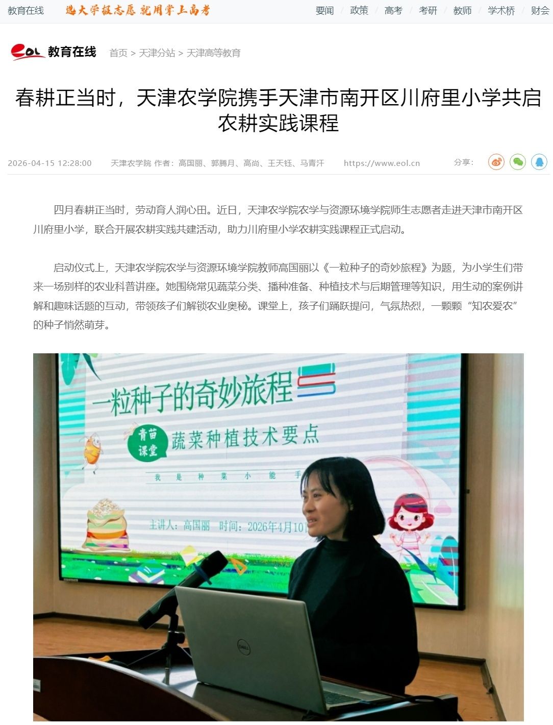 2026年4月15日,中国教育在线网报道,我校农学与资源环境学院师生志愿者走进天津市南开区川府里小学,联合开展农耕实践共建活动,助力川府里小学农耕实践课程正式启动。