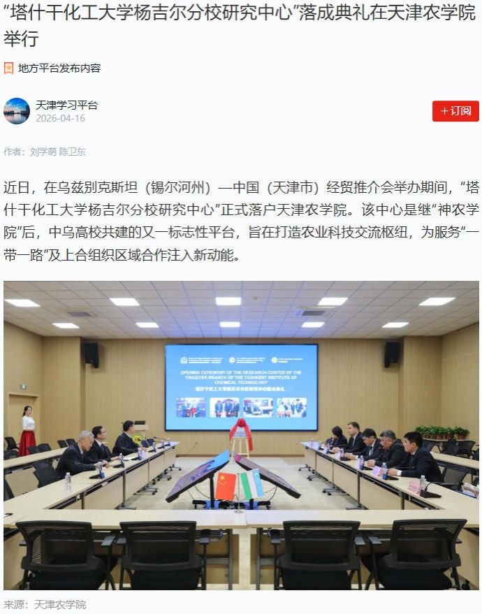 2026年4月16日,学习强国平台-天津学习平台报道,“塔什干化工大学杨吉尔分校研究中心”正式落户我校。该中心是继“神农学院”后,中乌高校共建的又一标志性平台,旨在打造农业科技交流枢纽,为服务“一带一路”及上合组织区域合作注入新动能。