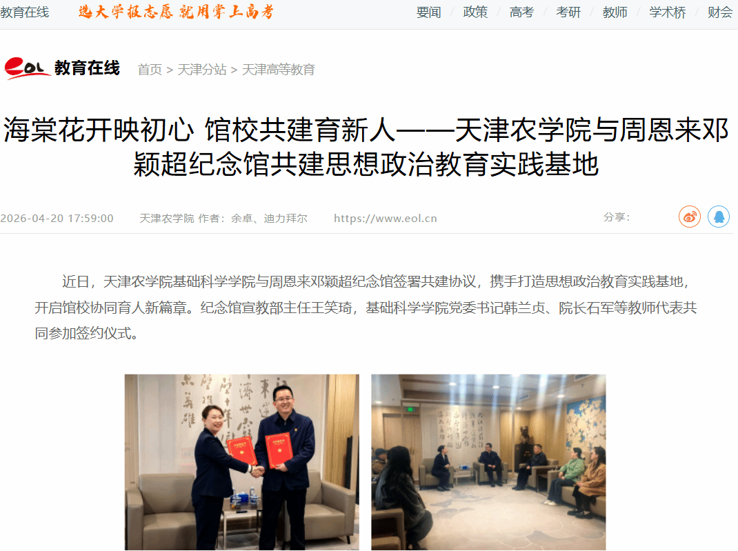 2026年4月20日,中国教育在线网报道,我校基础科学学院与周恩来邓颖超纪念馆签署共建协议,携手打造思想政治教育实践基地,开启馆校协同育人新篇章。